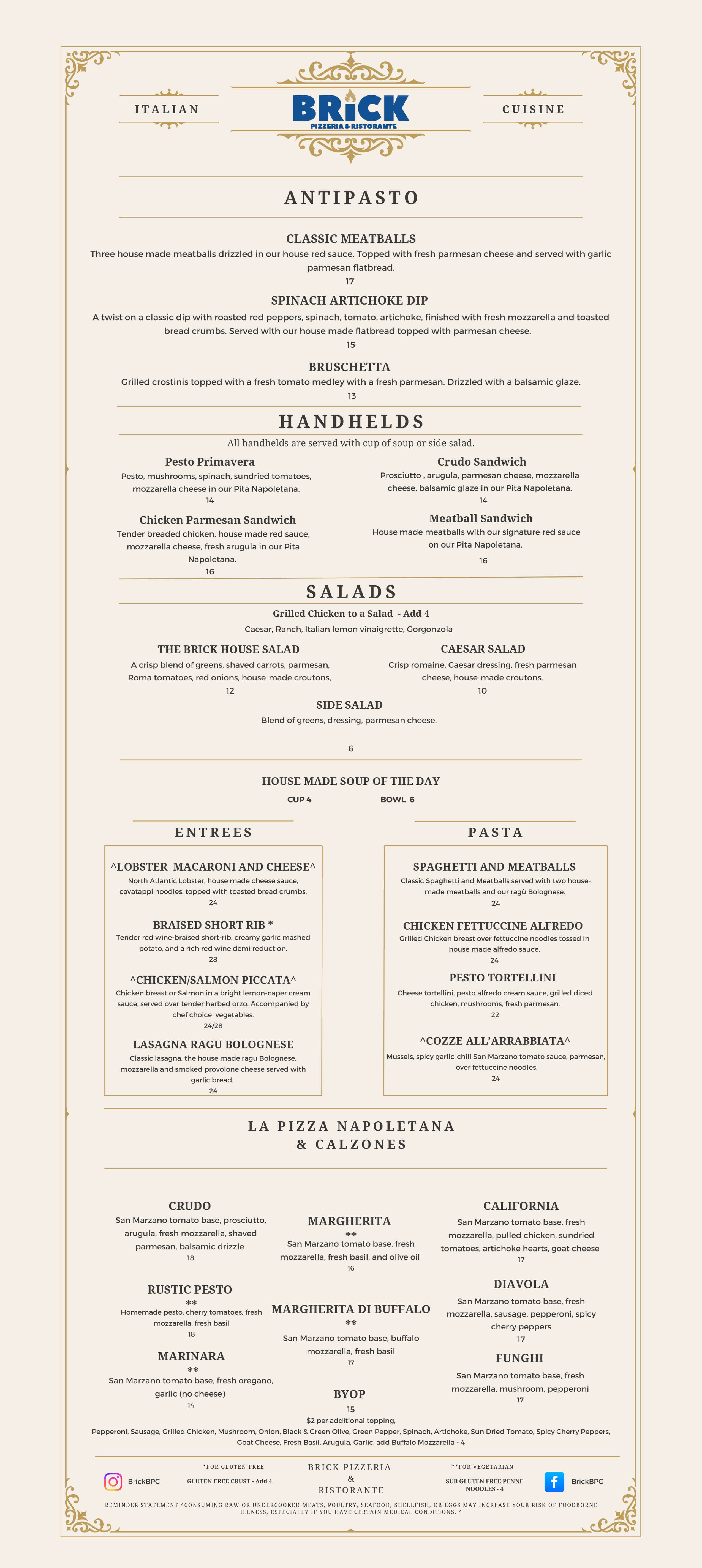 Brick Pizzeria & Ristorante brings an authentic brick oven Italian experience to Franklin. By way of Steamboat, CO. Partner and Pizzaiolo Leopoldo Demusis spent every summer among the hills of Sant'Angelo all'Esca, in the Campania region of Italy, where he found his love of food. In 2016, he realized his dream of bringing Neapolitan-style pizza from Napoli to Steamboat where he is a wildly successful restaurateur. Brick is our hometown connection to a little taste of Italy from the hand built, 100% brick oven to imported tomatoes and flour, we do our best to maintain the integrity and vibe of southern Italy.
